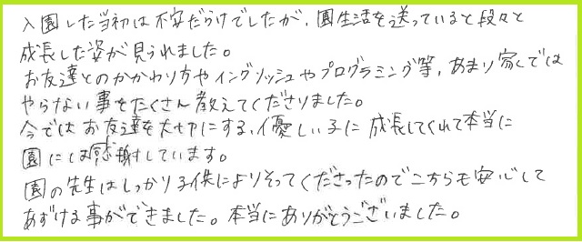 お友達とのかかわり方やEnglishやプログラミング等、あまり家ではやらないことをたくさん教えてくださいました。