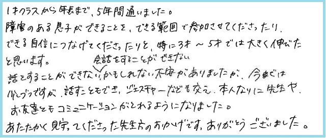 話をすることができない、会話をすることができないかもしれない不安がありましたが、今までは少しずつですが、話すこともでき、ジェスチャーなども交え、本人なりに先生やお友達ともコミュニケーションがとれるようになりました。