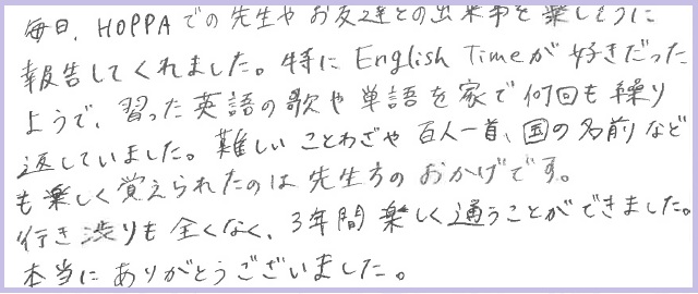 毎日、HOPPAでの先生やお友達との出来事を楽しそうに報告してくれました。
