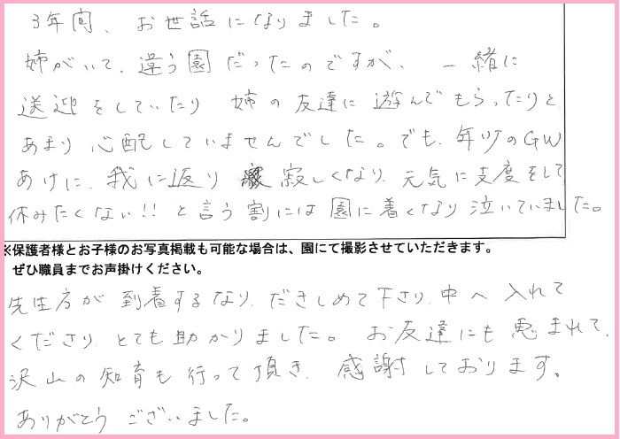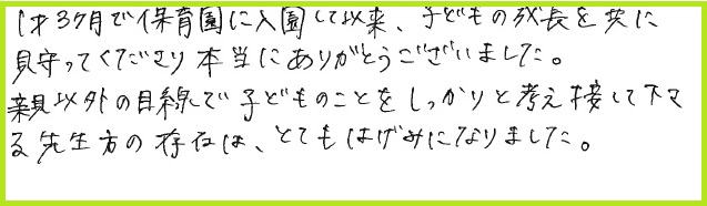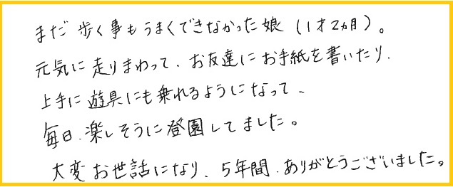 1歳3ヶ月で保育園に入園して以来、子どもの成長を共に見守ってくださり本当にありがとうございました。