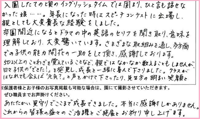 今回のブログでは、卒園児の保護者様からいただいたメッセージをご紹介します😊