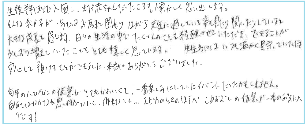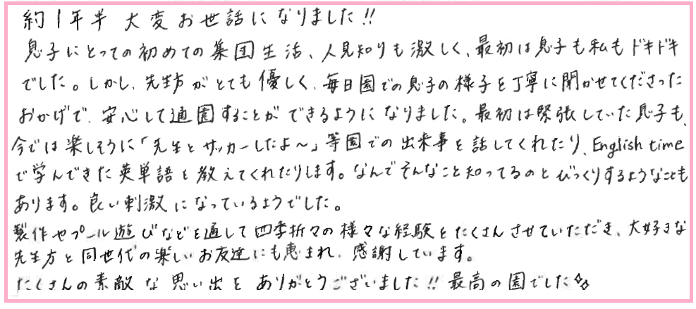 しかし、先生方がとても優しく、毎日園での息子の様子を丁寧に聞かせてくださったおかげで、安心して通園することができるようになりました。