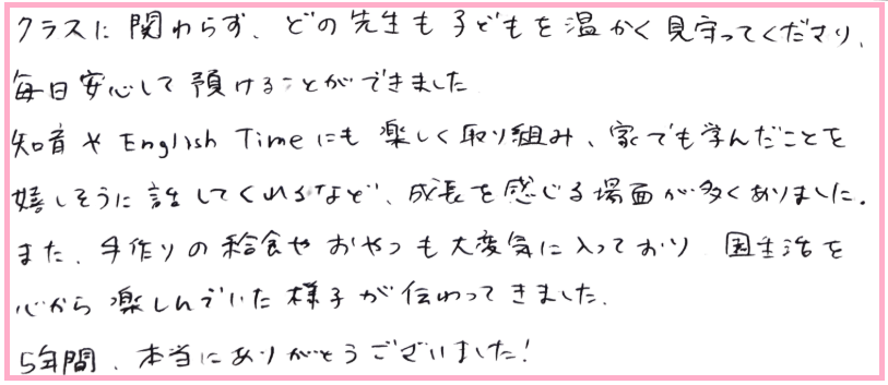 今回のブログでは、卒園児の保護者様からいただいたメッセージをご紹介します😊
