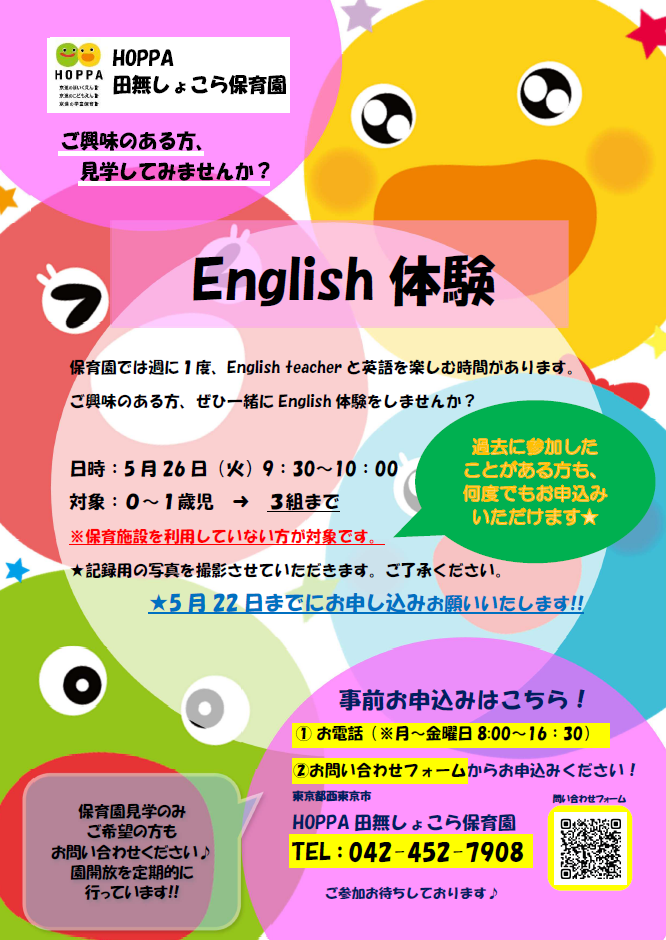 【西東京市イベント情報】English体験をしませんか?【HOPPA田無しょこら保育園】