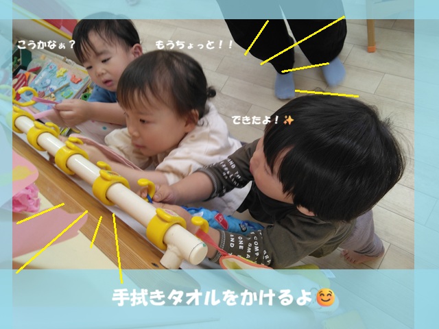 シリウス組さん(2歳児)は、憧れのシリウス組さんになり、手拭きタオルをかける時も嬉しそうな表情です!😆✨