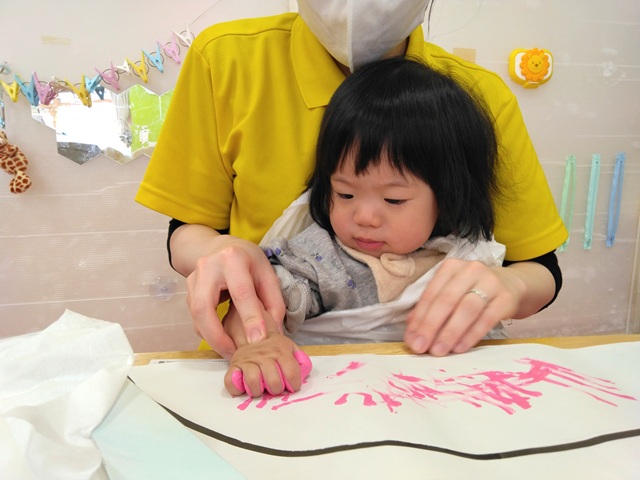 スピカ組(0歳児クラス)は、手に絵の具をつけて手形スタンプに挑戦。