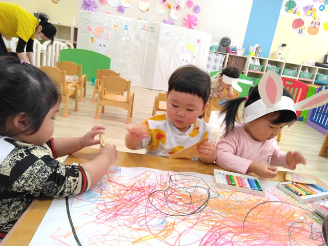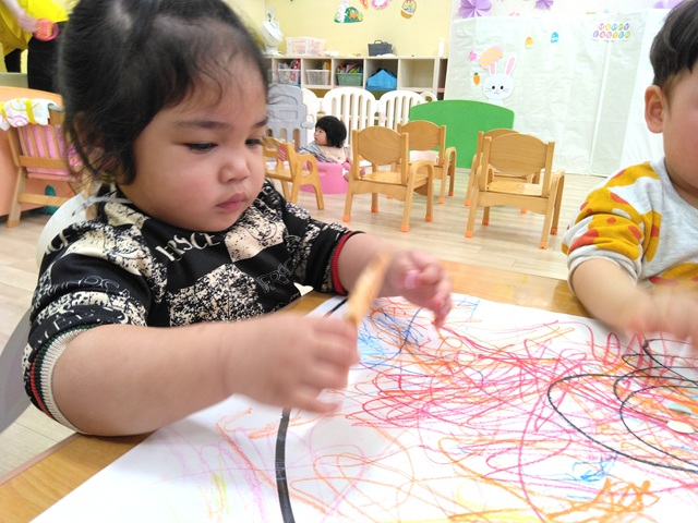 ベガ組(1歳児クラス)は、マーカーでじろじろと色塗りをしました。
