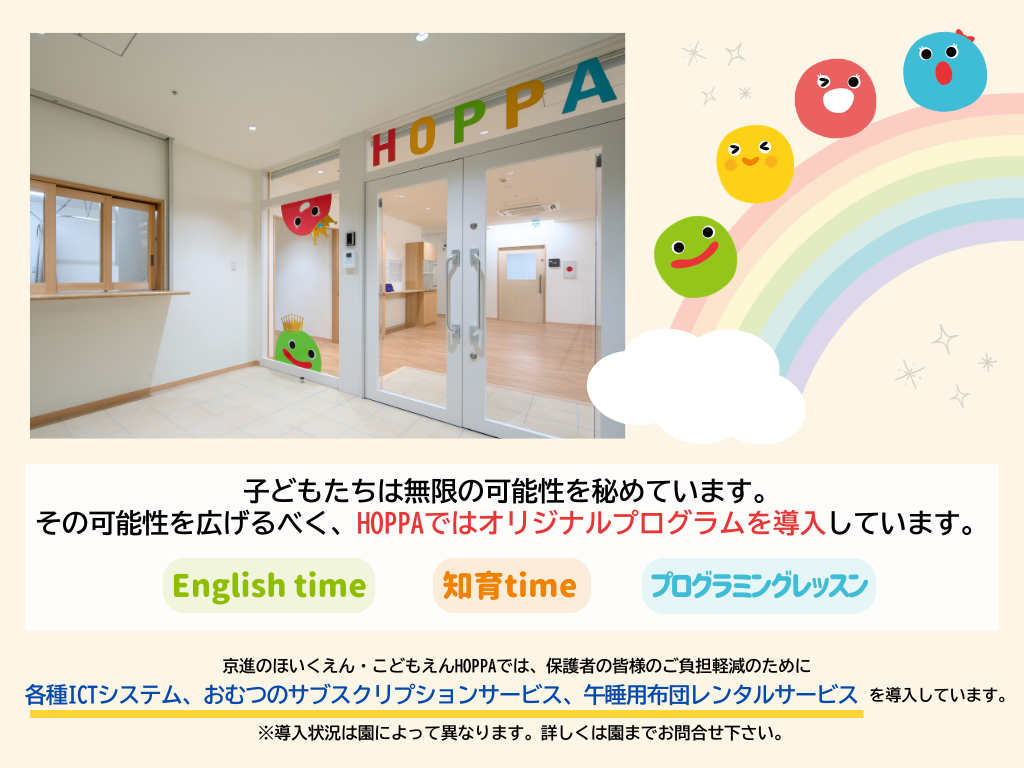| 10:00 | 設定保育【お散歩・製作活動等】0歳児:ミルク・離乳食 | 設定保育【お散歩・製作活動等】 |
