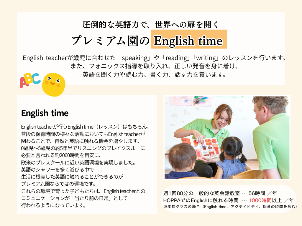 | 9:30 | アクティビティ | English time ・知育time(クラス別) |
