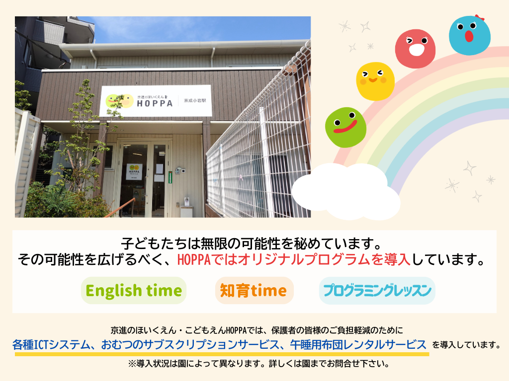 | 15:00 | おやつ・牛乳 | おやつ・歯磨き・帰りの会・自由遊び・散歩・知育time・English time |