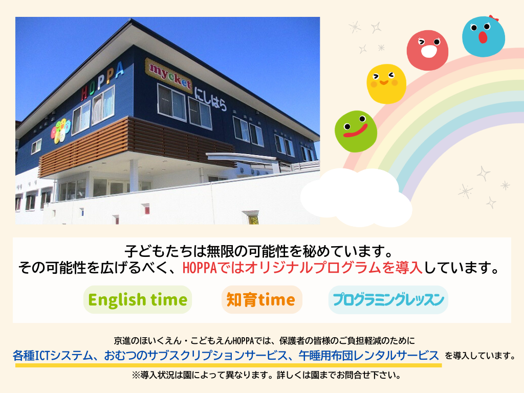 | 10:00 | 設定保育【お散歩・製作活動等】0歳児:ミルク・離乳食 | 設定保育【お散歩・製作活動等】 |