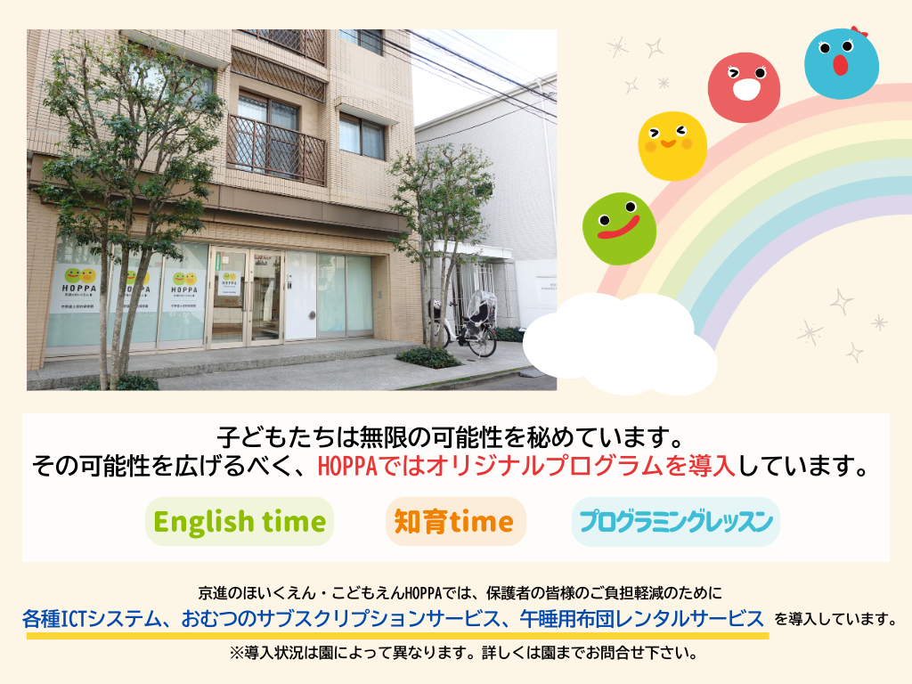 | 16:00 | 自由遊び・散歩 ※1・2歳児:知育time お迎え |