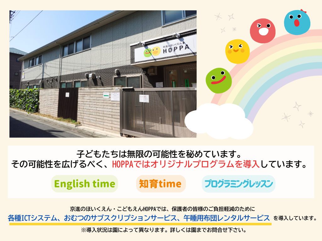 | 15:00 | おやつ・牛乳 | おやつ・歯磨き・帰りの会・自由遊び・散歩・知育time・English time |