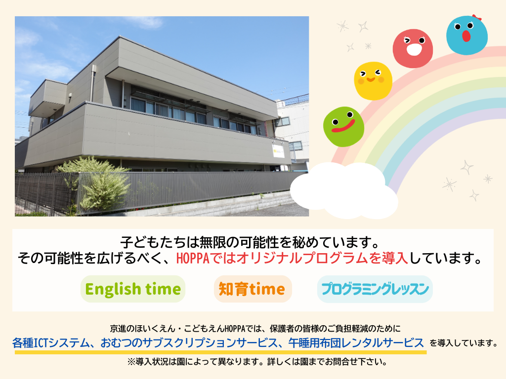 〒120-0003 東京都足立区東和2丁目26-9 TEL:03-6802-5291 保育時間中は子どもたちの活動によって、詳細にお答えできる時間がとれない場合がございます。ご了承下さい。