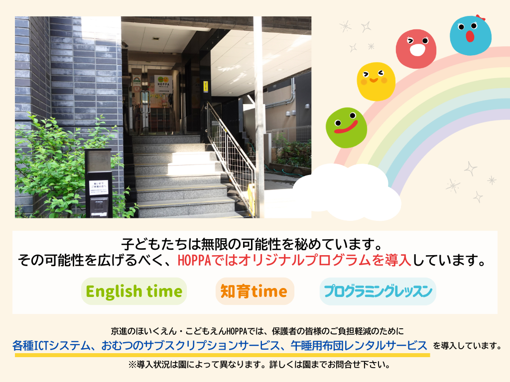 | 16:00 | 自由遊び・散歩 ※1・2歳児:知育time お迎え |